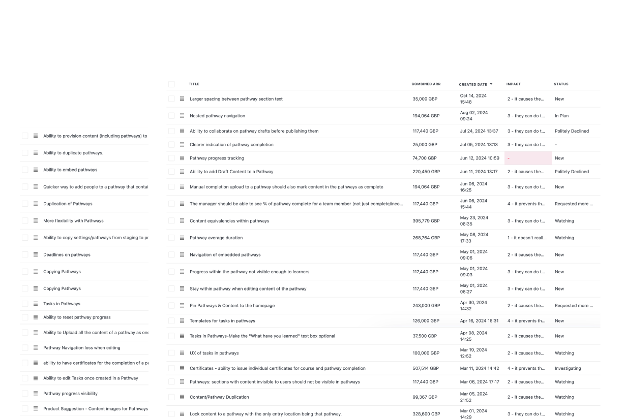 Using Planhat, our feedback-gathering tool, I triaged user requests and identified 56 specific issues related to Pathways and began to group feedback into underlying themes. We prioritised the issues that surfaced most frequently—treating these as signals of recurring pain points across our user base.