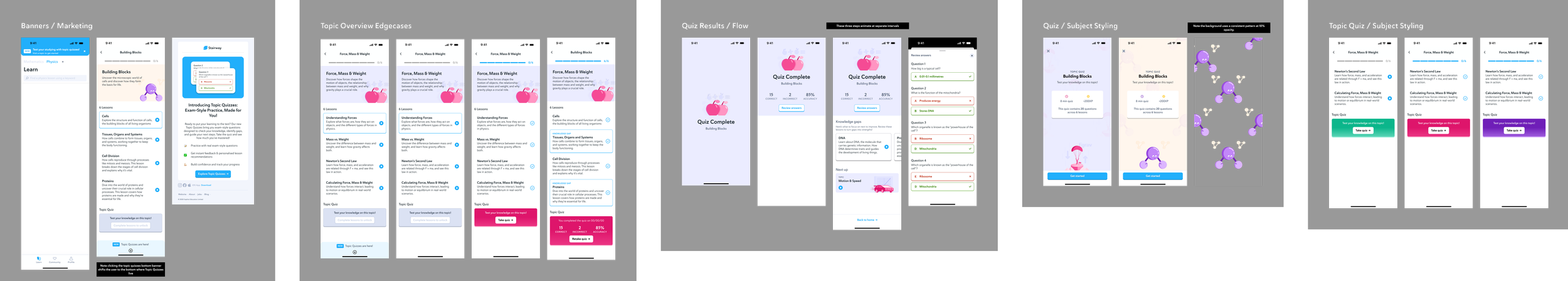 It was time to start wireframing the experience. Quizzes lived at topic-level which gave me confidence first to begin exploring how quizzes display within the existing screens.