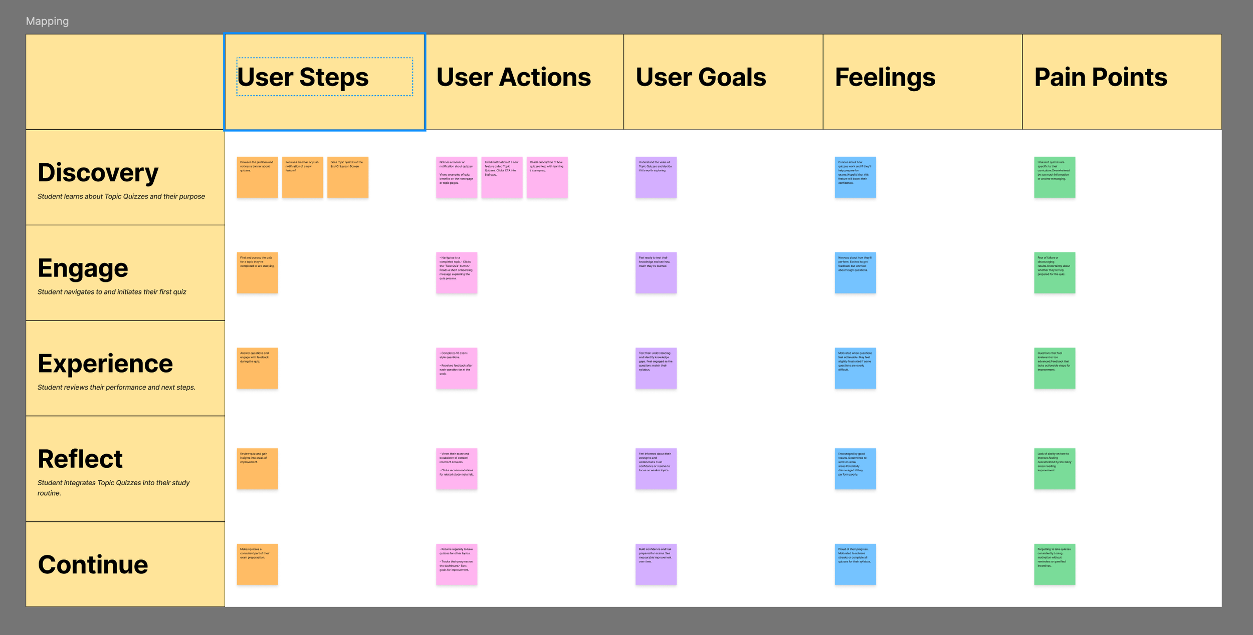 To ensure Topic Quizzes seamlessly fit into the student revision experience, we mapped out the user journey from discovery to engagement. This exercise allowed us to step into the student's perspective, uncovering what they were thinking, feeling, and struggling with at each stage-from landing on the homepage to starting a quiz.